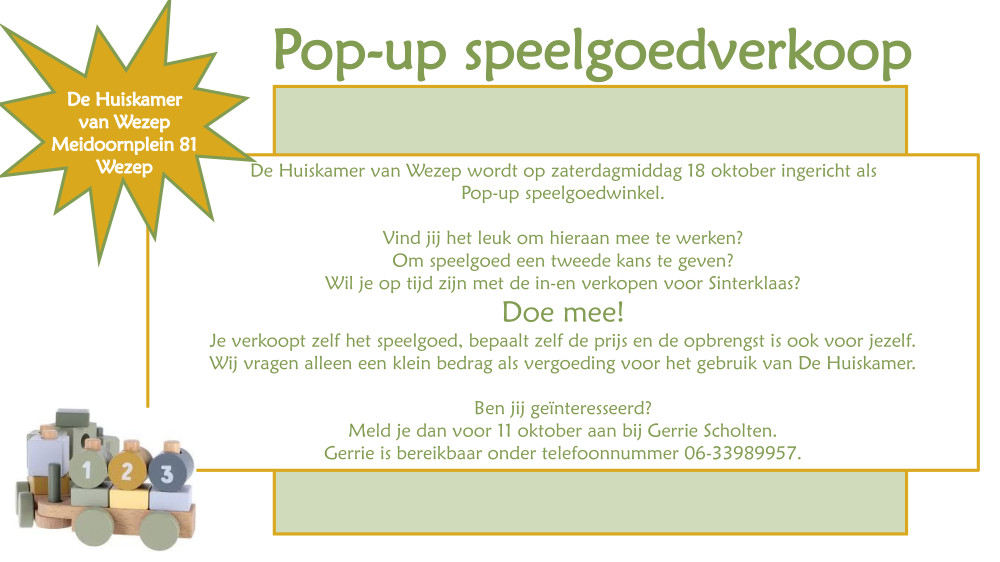 De Huiskamer van Wezep wordt op zaterdagmiddag 18 oktober ingericht als Pop-up speelgoedwinkel.