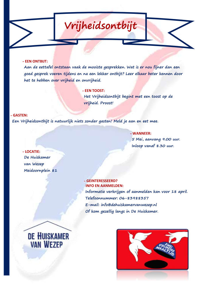 Het kan zo langzamerhand niemand meer ontgaan zijn: in 2025 viert Nederland 80 jaar vrijheid. Ook de Huiskamer van Wezep besteed aandacht aan dit memorabele moment en wel met een ontbijt voor 100 mensen…..lees verder op de website van de Huis aan Huis